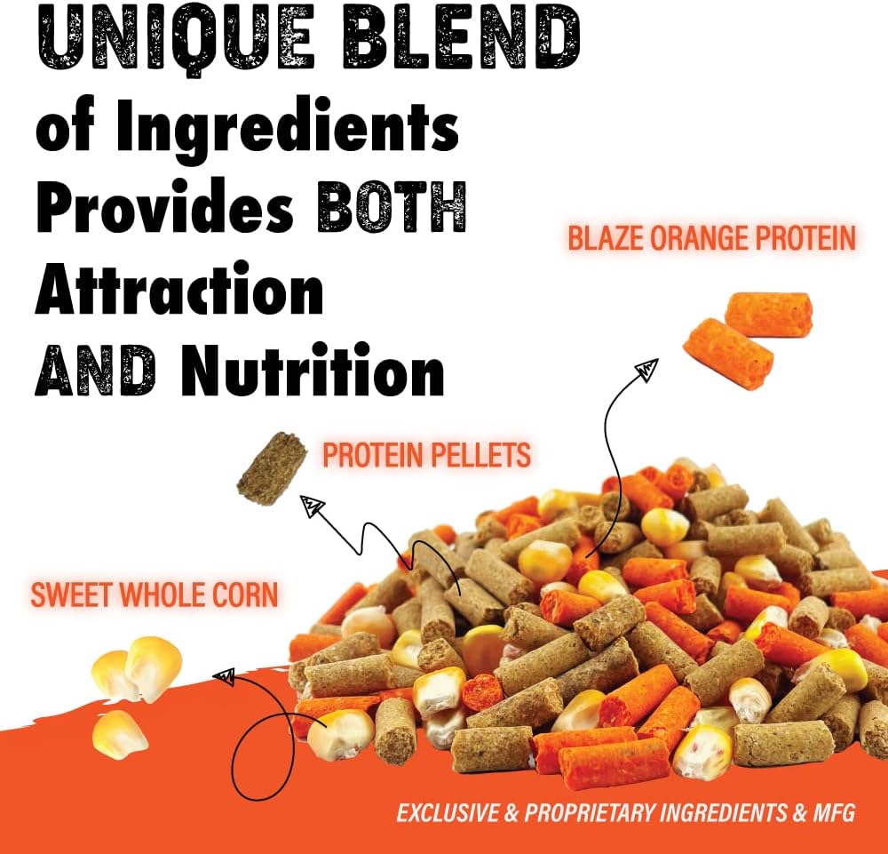 BLAZE 4-4-2 DEER FEED ATTRACTANT - Deer & wildlife attractant made with blaze orange protein pellets. Each bag is a mix of 40% protein pellets, 40% corn & 20% orange blaze pellets. Blaze orange is packed with the sweet corn flavor deer & hogs crave.